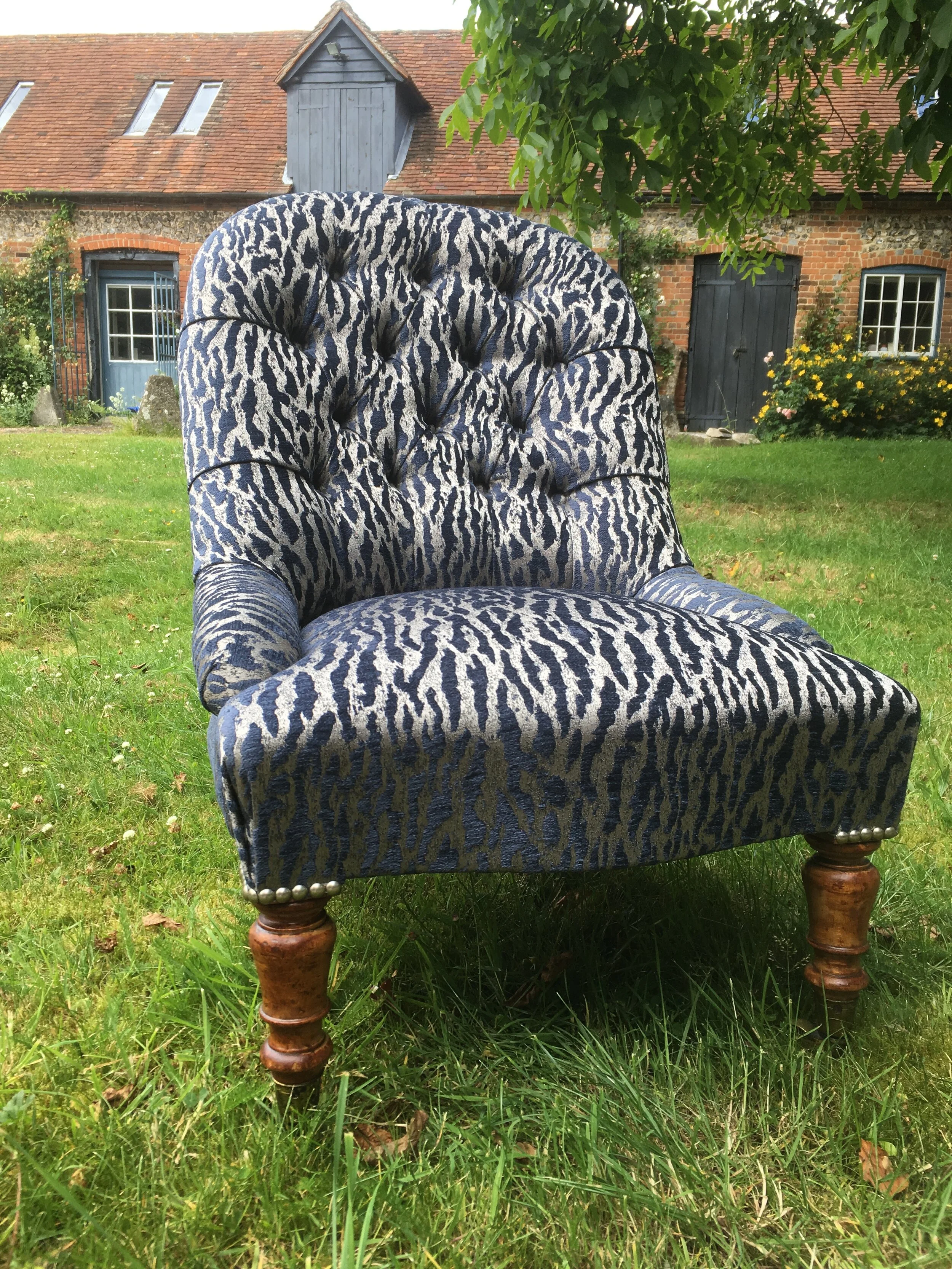 A Victorian Iron back chair completely stripped and reupholstered using only traditional techniques. This beautiful chair has been finished in Gautier Indigo, by Clarke and Clarke.